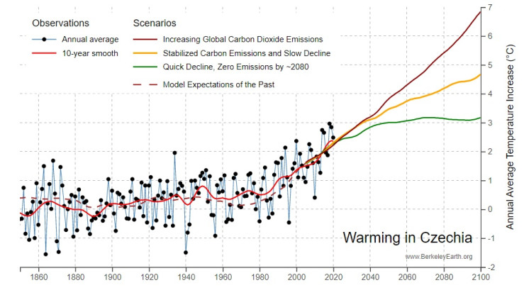 The average temperature has increased by around 2.4° C in the Czech Republic since 1850. By 2050, it is expected to increase by approximately 1.4 to 1.9°C. However degree of further warming depends on the amount of greenhouse gases we continue to release, and many forests will disappear from our landscape. Without dramatic action to prevent warming, we can expect an increase in global temperatures by 4°C in Czech Republic by the end of the century compared to 1981-2010. This would have significant consequences.